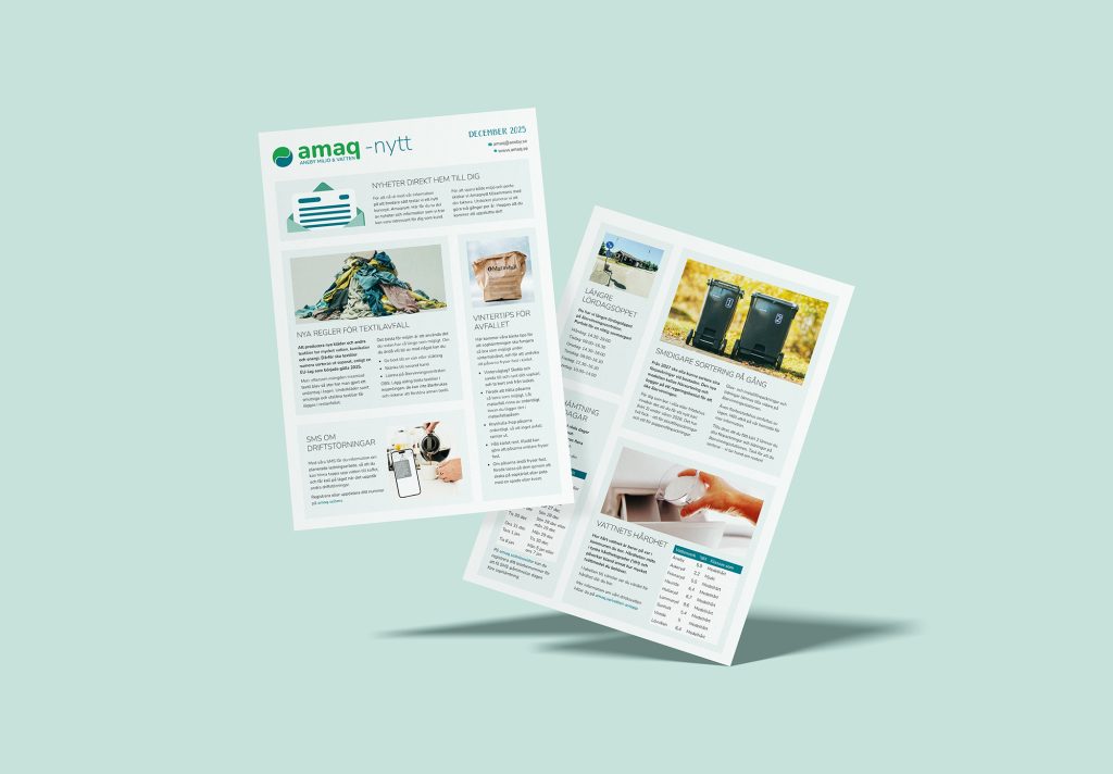 Nu har vi skickat ut den andra utgåvan av Amaqnytt, med aktuella nyheter och information till dig som kund. För att spara både miljö och portokostnader skickas Amaqnytt tillsammans med fakturan två gånger om året.
